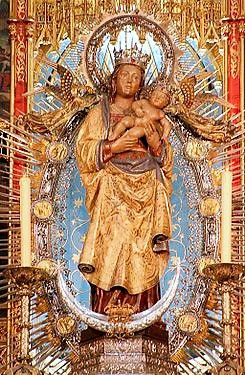 La talla de la Virgen se encuentra en el brazo derecho del crucero de la catedral, enmarcada por un retablo de tablas pintadas, gótico del siglo XIV, realizado por Juan de Borgoña, procedente de Oropesa (Toledo), y regalado por el cardenal Ángel Suquía. El retablo, colocado en alto, es accesible mediante unas escalinatas que bordean un arco escarzano, donde se encuentra la capilla funeraria de la reina María de las Mercedes de Orleáns, esposa de Alfonso XII, gran devota de la Virgen.